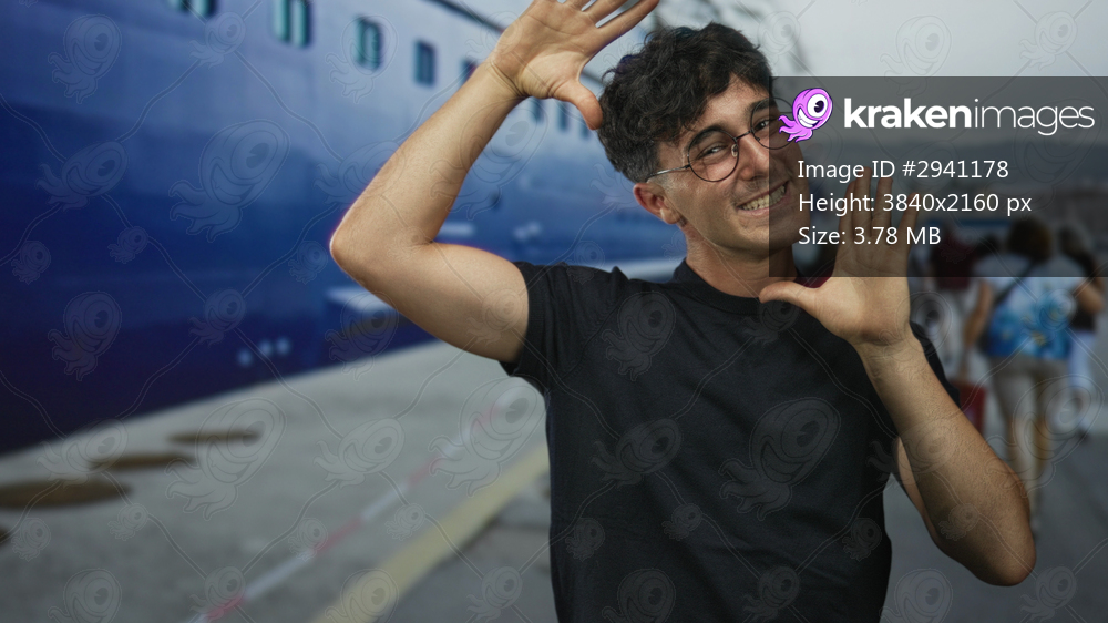 Man frames his face with hands at port beside a moored ship and smiles, wearing glasses and black shirt; playful curiosity.