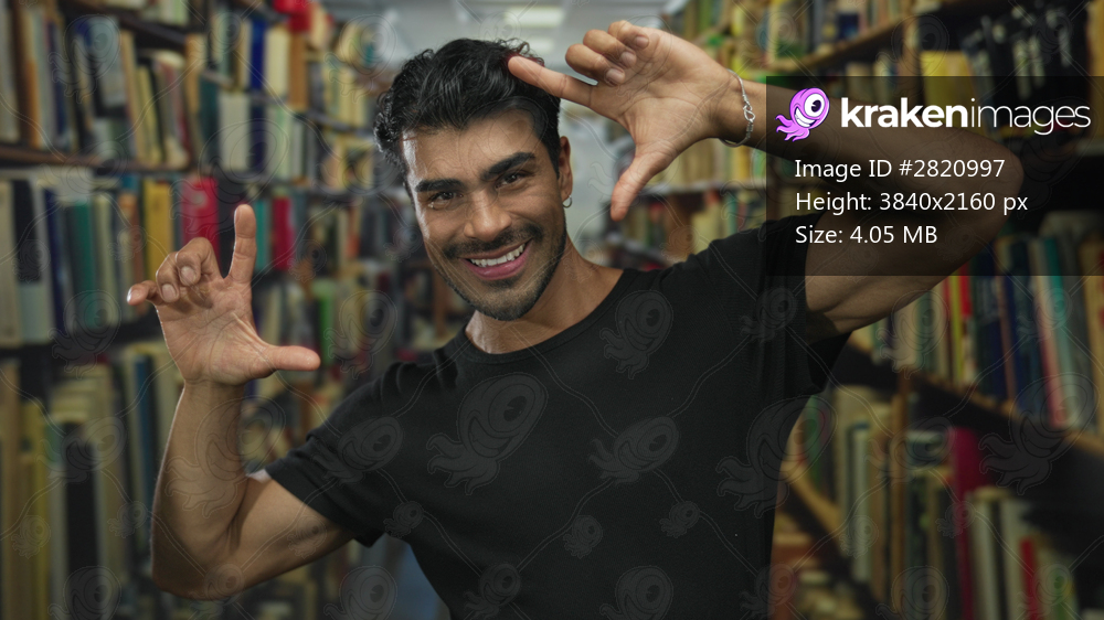 Man frames tall wooden bookshelves with bare hands in building aisle while smiling; creative inspiration.