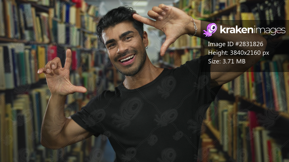 Man frames tall wooden bookshelves with bare hands in building aisle while smiling; creative inspiration.