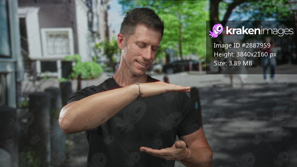 Man framing an invisible rectangle with hands and forearms on a street in front of house entrances while smiling casually; confidence approachable.