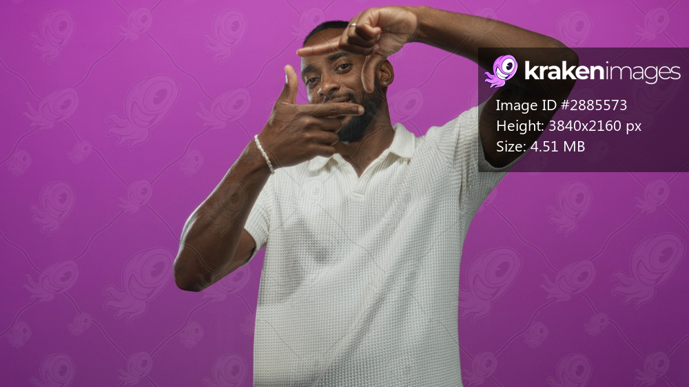 Man framing face with fingers in posed studio against vibrant purple backdrop; creativity inspiration.