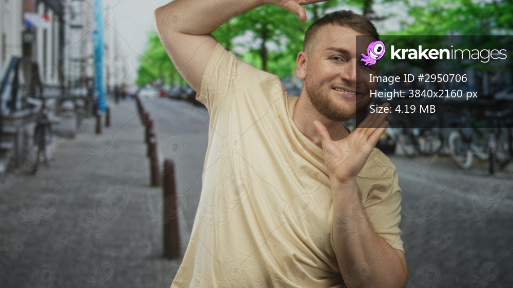 Man framing face with hands and tilted head on cobbled street in beige tshirt smiling broadly with beard visible; playful confidence.