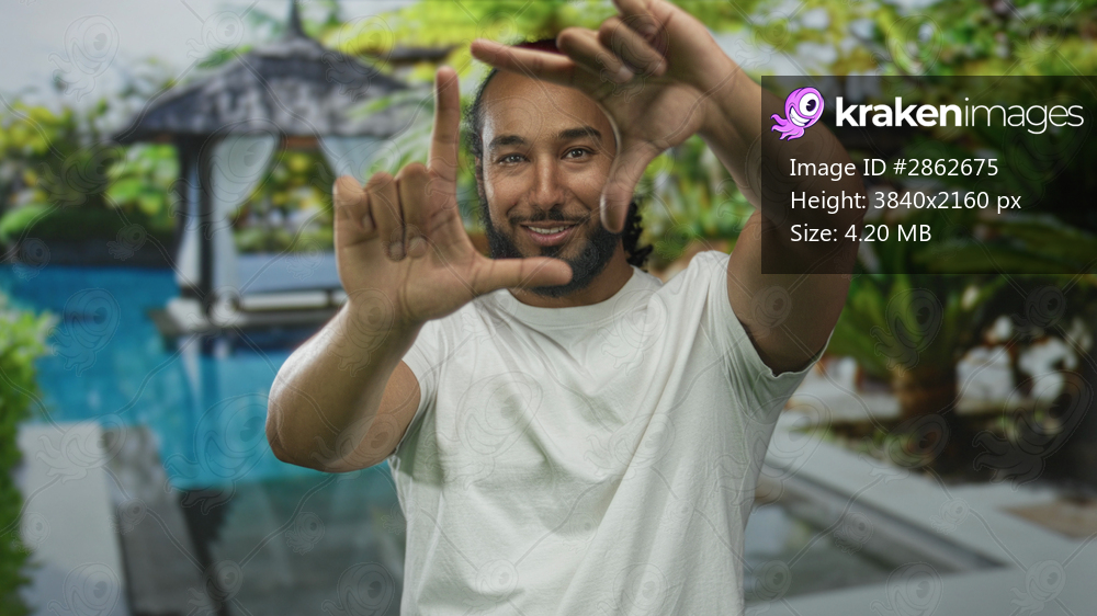 Man framing with hands at a resort pool outdoors, smiling and making a rectangular frame gesture with fingers while wearing a white t shirt; calm vacation moment. - Kraken Images