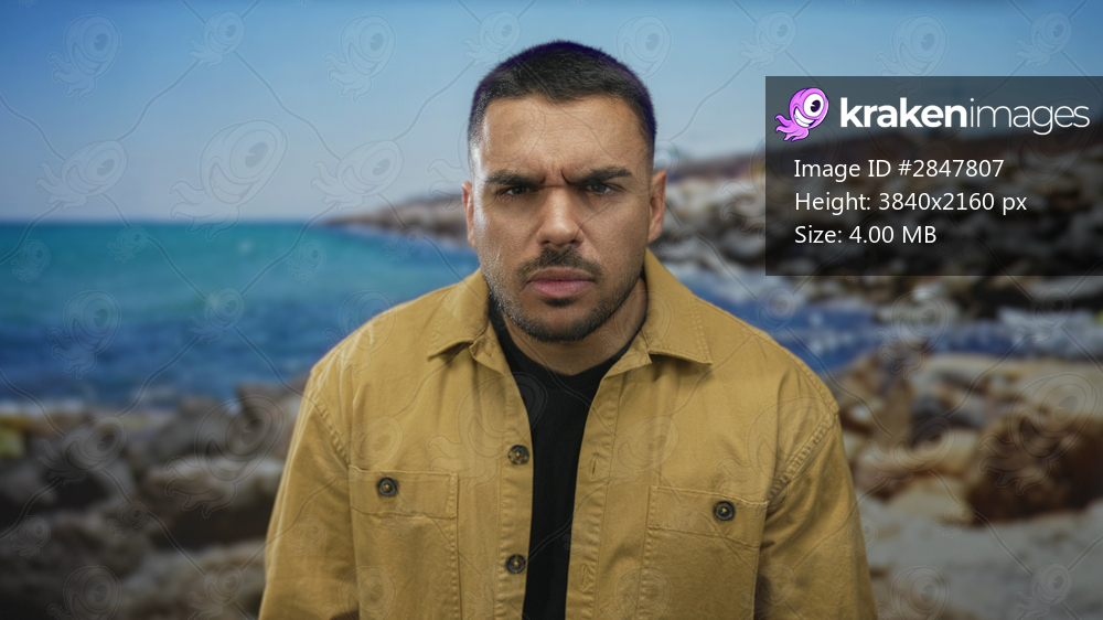 Man frowns with knit eyebrows in studio near sunlit rocky shore for a coastal portrait; seriousness.