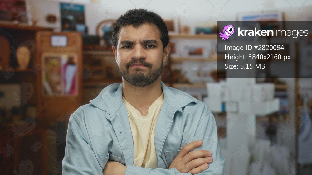 Man frowns seriously and folds arms in bright studio lined with wooden shelves; rejection doubt frustration.