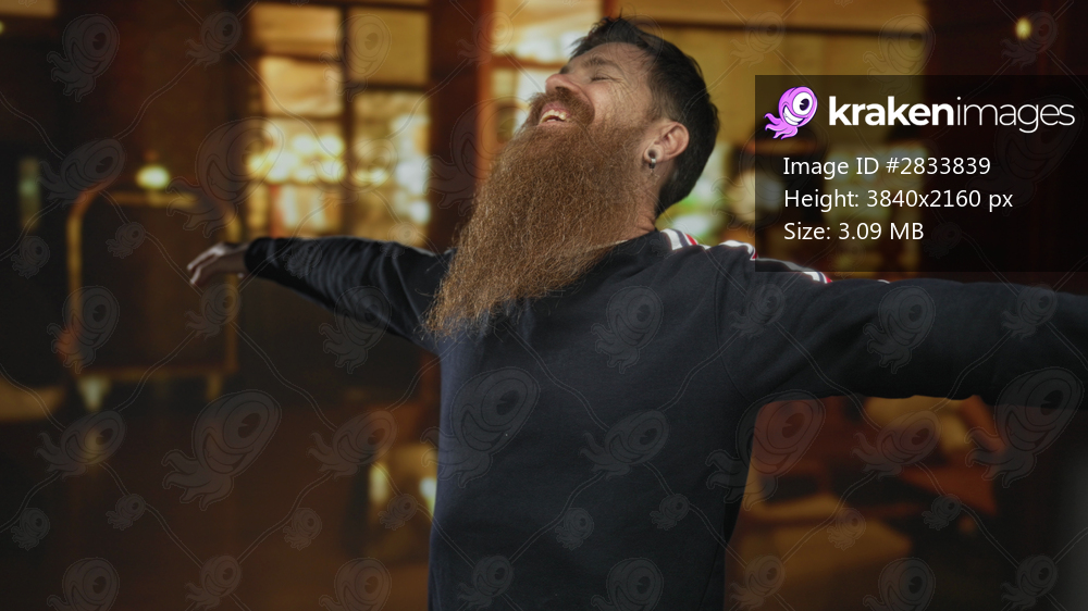 Man with full beard and outstretched arms stands in a building hallway filled with warm light; serenity.
