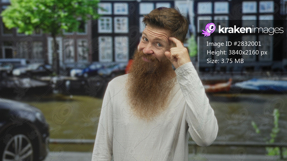 Man with full beard raises index finger to temple on street by a canal building facade; curiosity and introspection.