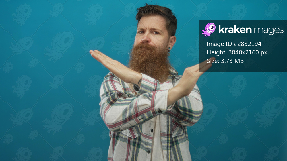 Man with full ginger beard and plaid shirt crosses arms in x gesture on a blue studio set; rejection.