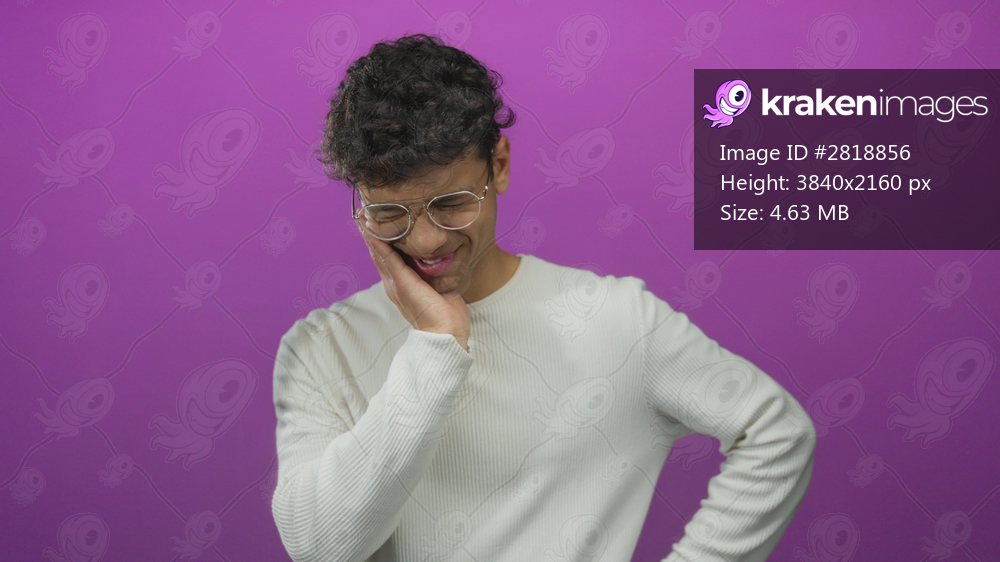 Man gently rubbing cheek in vivid purple studio set with glasses and knit sweater showing discomfort; pain.