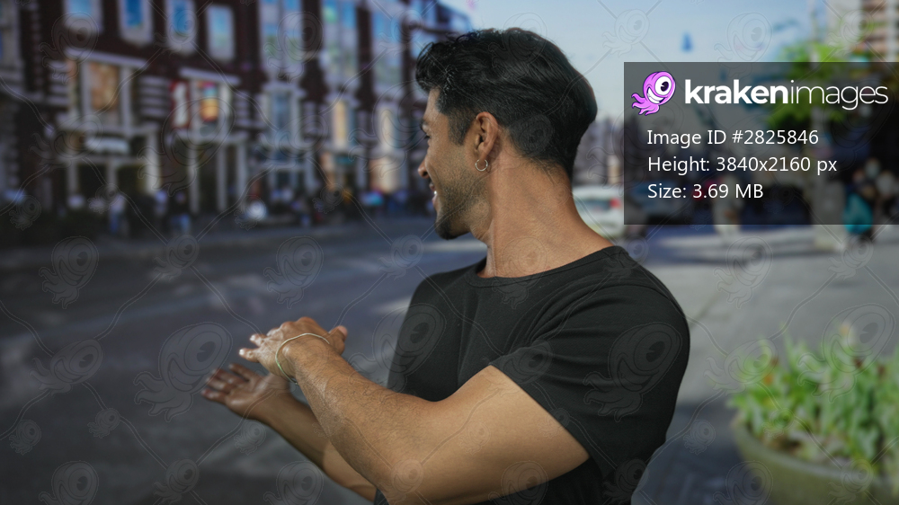 Man gestures hand to sunlit busy urban street lined with brick storefronts and parked cars; optimism.