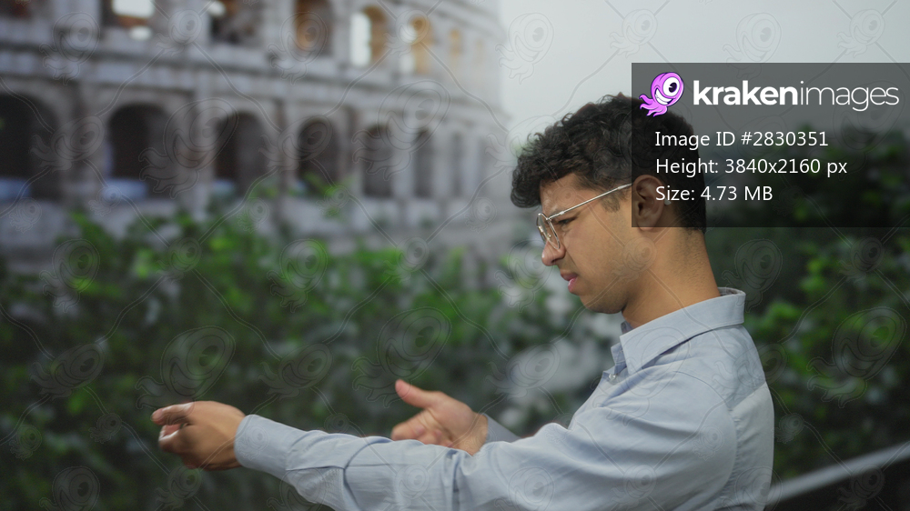 Man gestures with hands toward coliseum building in daylight wearing light blue shirt and glasses; curiosity.