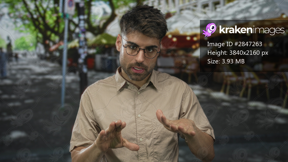 Man gestures with open hands and speaks on a sunlit street beside a building facade amid leafy trees; calm appeal.