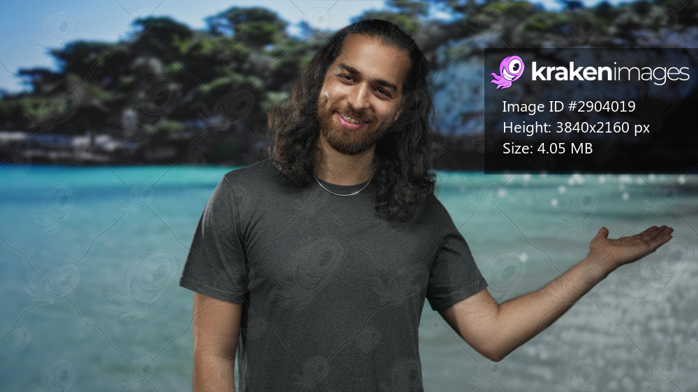 Man gestures palm up at studio seascape with outstretched arm and warm smile; travel presentation serenity.