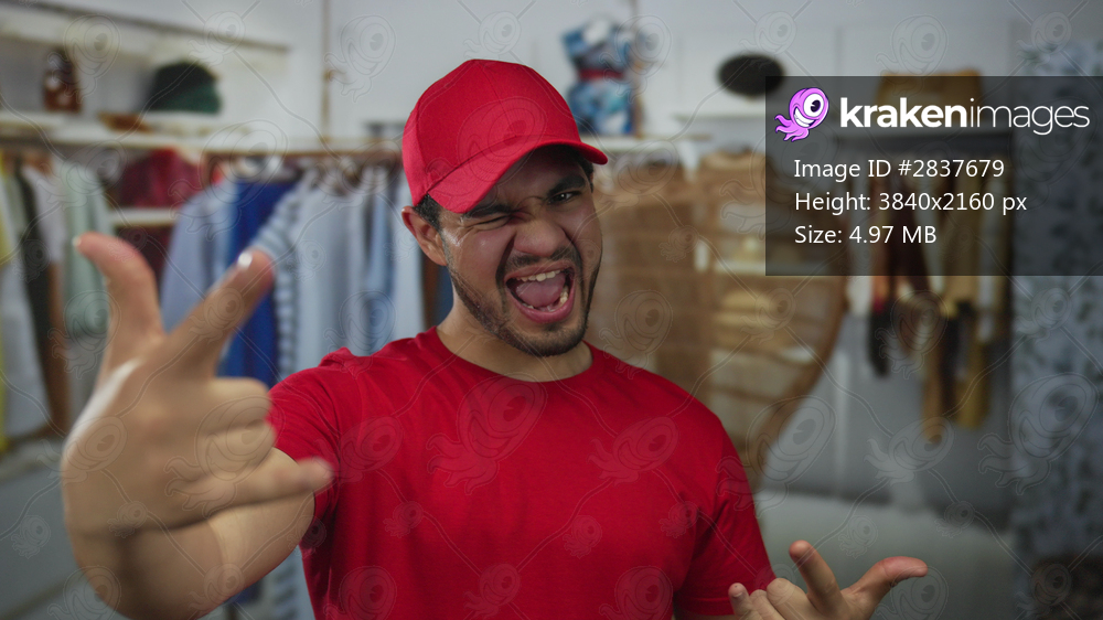 Man gestures rock horns with both hands in clothing store building amid hanging clothes; excitement celebration.