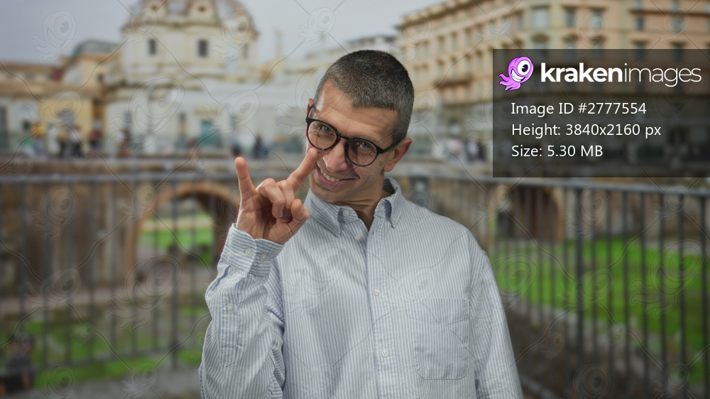 Man gestures rock sign while smiling at roman ruins street, wearing glasses and striped shirt, showcasing outdoor urban architecture in a vibrant setting. - Kraken Images