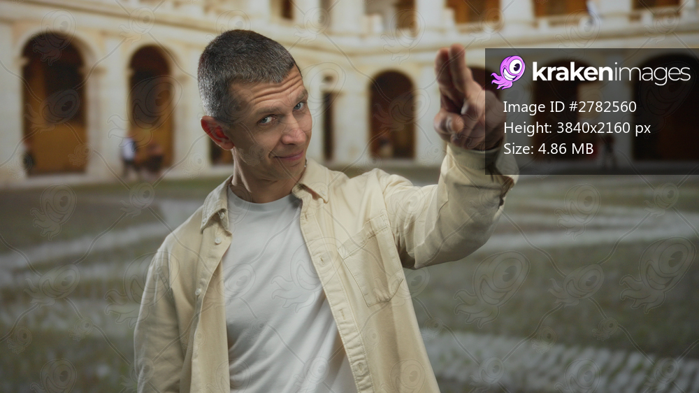 Man gesturing with fingers on his head in a historic university courtyard setting showcasing an architectural background and casual attire appearance outdoors. - Kraken Images