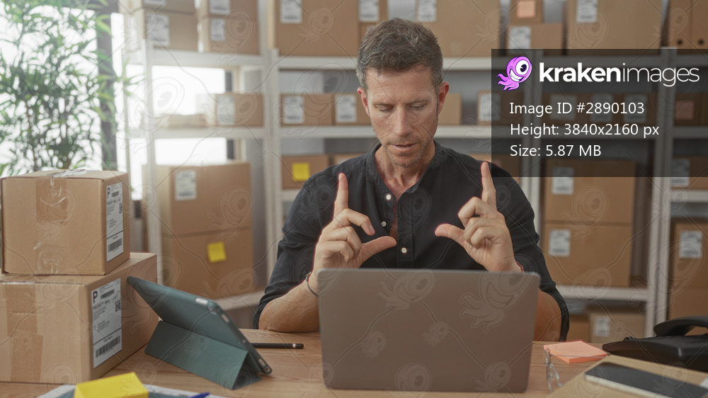 Man gesturing with fingers over laptop surrounded by parcel boxes on shelving racks in building; concentration business planning.
