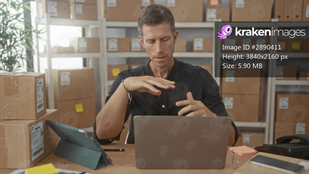 Man gesturing with fingers over laptop surrounded by parcel boxes on shelving racks in building; concentration business planning.