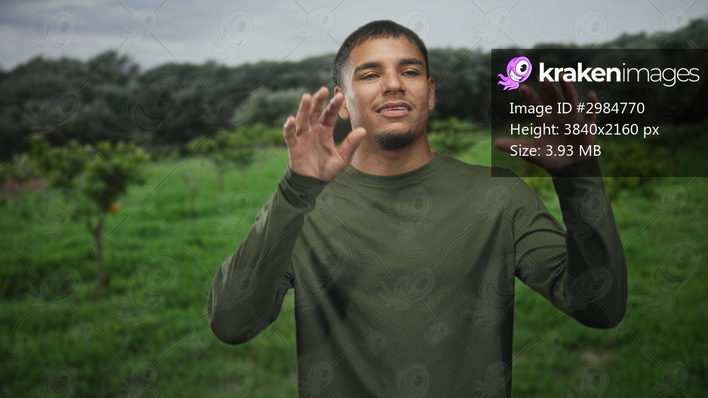 Man gesturing with hands in an orchard among young trees, wearing a green long sleeve shirt and slight smile; serenity.