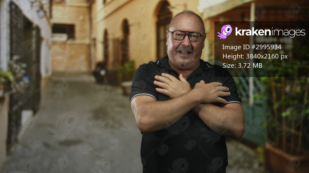 Man gesturing with hands near chest, smiling and wearing glasses and a black polo while standing in a narrow street lined with potted plants and arches; warmth conversation ease. - Kraken Images