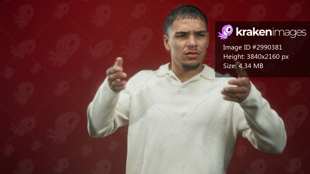 Man gesturing with hands and tugging at his white pullover in a red studio, palms and fingers visible while making an expressive face; frustration.