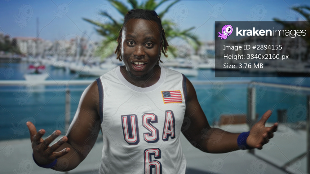 Man gesturing with hands wearing usa jersey and wristbands by marina railing and building, boats visible; pride patriotism.