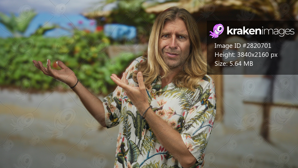 Man gesturing open hand with confused expression at building entrance door with long hair and floral shirt; uncertainty.