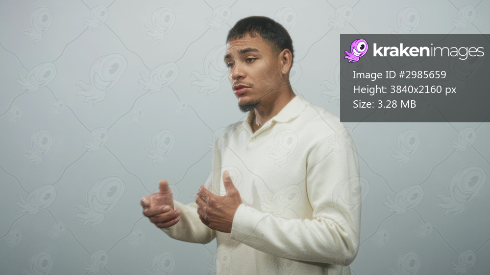 Man gesturing with open hands while speaking in a plain studio, wearing a cream sweater and facing left; thoughtful explanation.