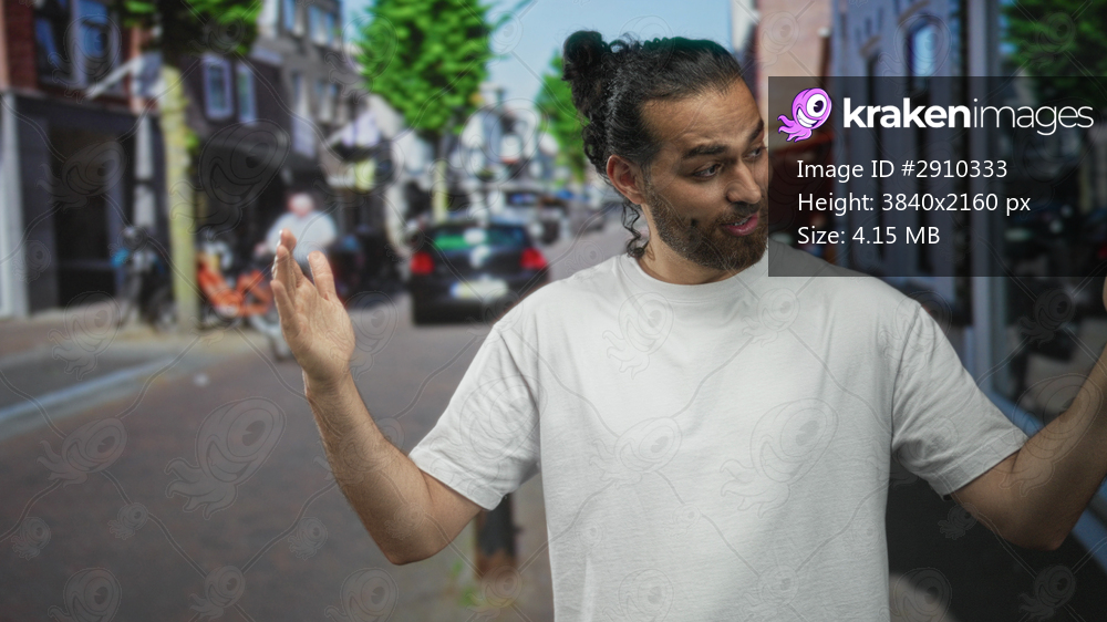 Man gesturing with open palms and raised hands on a sunny city street wearing a white t shirt and bun hairstyle; playful shrug.