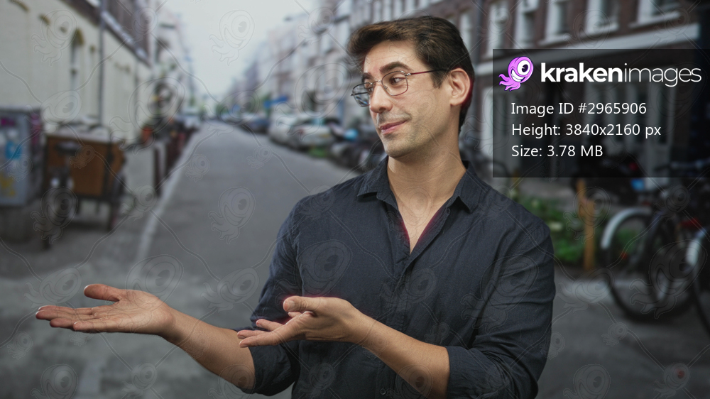 Man gesturing with open palms and smiling on a street beside bicycles and buildings; friendly connection.