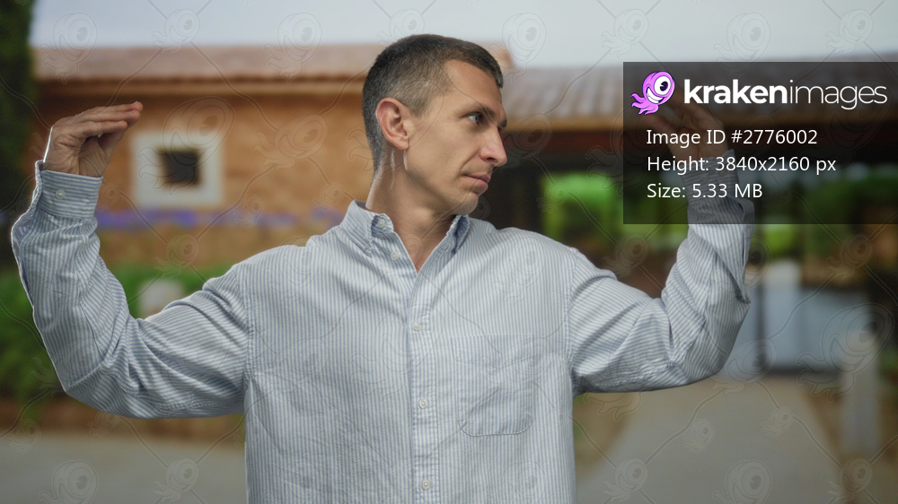 Man gesturing outdoors with hands raised wearing casual striped shirt in front of rustic house in sunny setting evokes expression and communication.