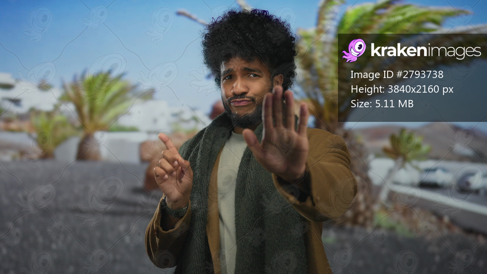 Man gesturing outdoors with palm trees under a clear sky, wearing a jacket and scarf, portraying a confident attitude in a tropical urban environment.