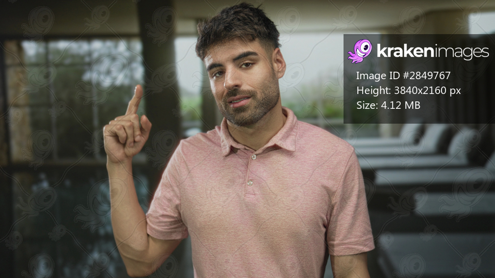 Man gesturing palm by modern building indoor spa pool with relaxed posture; welcome comfort relaxation.