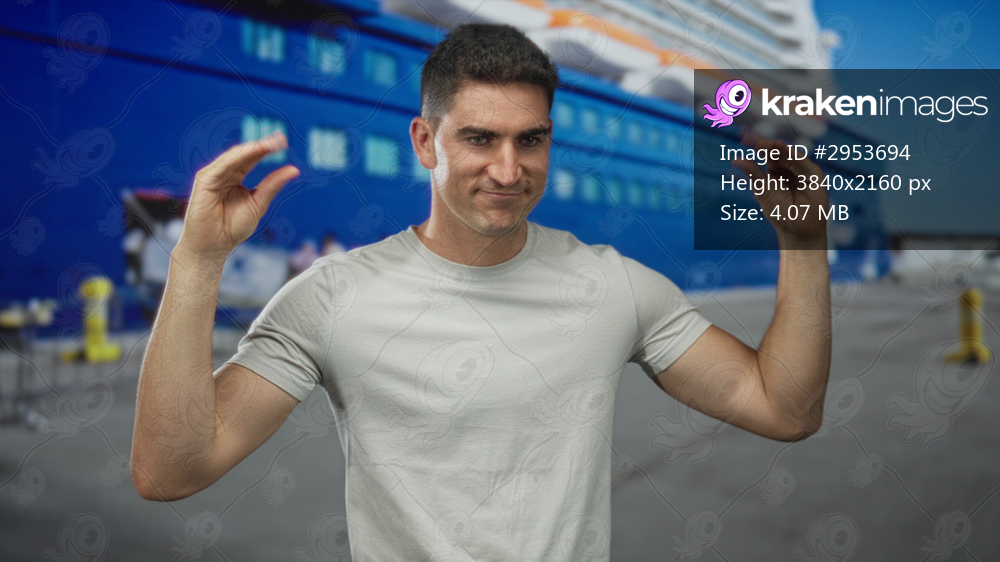 Man gesturing with raised hands beside a large cruise ship at a street pier, palms visible and open; casual confidence.