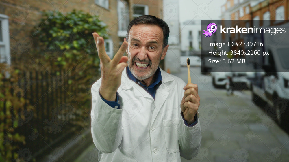 Man gesturing with toothbrush in urban city street, wearing white coat, appearing humorous and energetic against backdrop of vehicles and buildings.