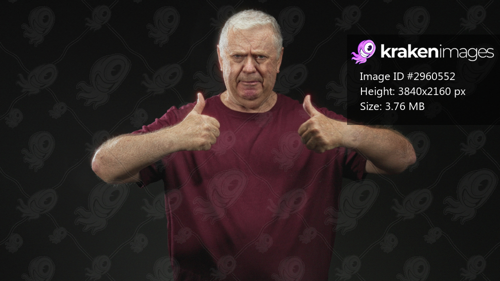 Man gives double thumbs up with visible thumbs and forearms in studio wearing burgundy tshirt amid varied facial expressions; hesitation humor.