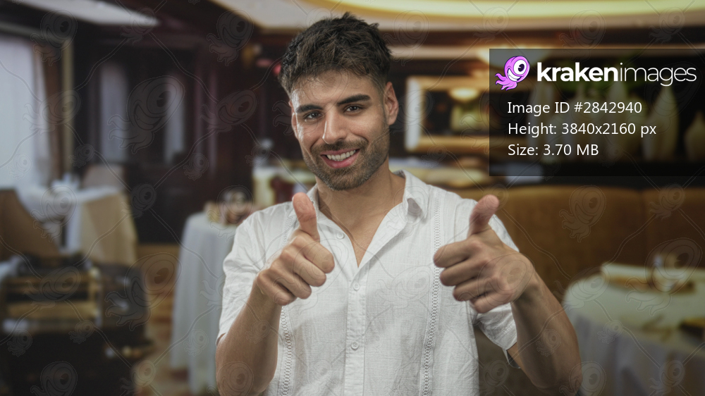 Man gives enthusiastic thumbs up gesture inside stylish restaurant interior; confidence and friendly welcome.