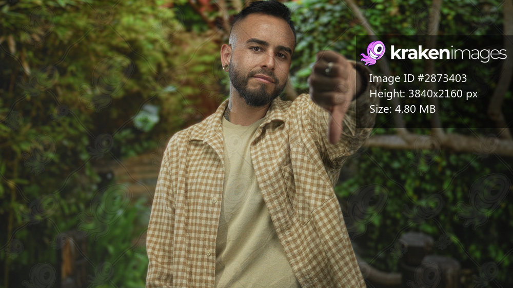 Man gives thumbs down gesture in a forest park setting with green foliage and wooden railing; disapproval.