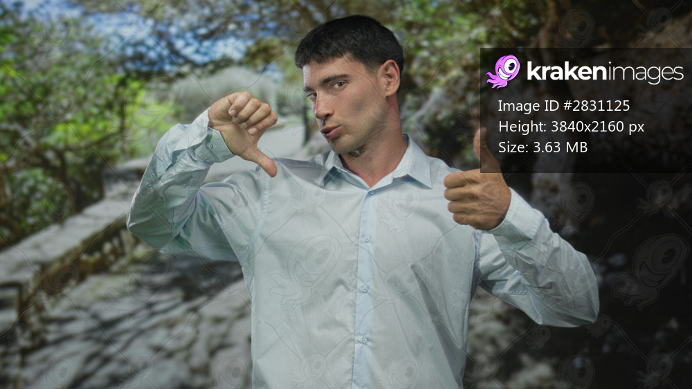 Man gives thumbs up with one hand and thumbs down with the other while standing in a forest; ambivalence.