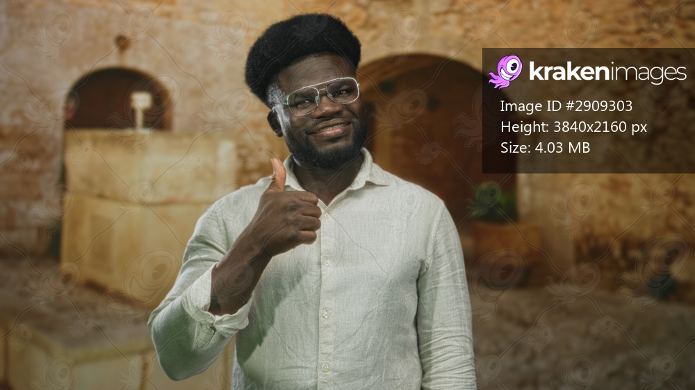 Man gives thumbs up and places hand on chest on old town street, wearing glasses and a light linen shirt while smiling; confidence.