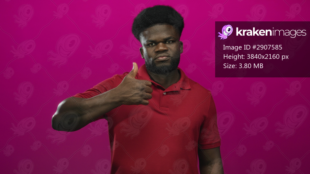 Man gives thumbs up with right hand and visible thumb wearing red polo shirt in studio against magenta wall; confidence support.