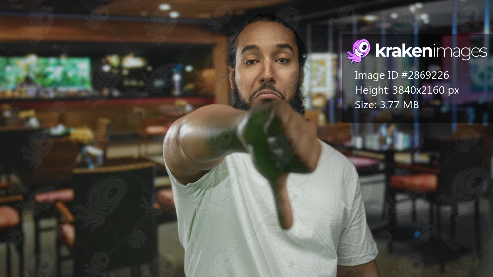 Man gives thumbs up to camera in a restaurant dining area, hand extended toward lens, smiling in a casual white tee; approval friendliness trust.