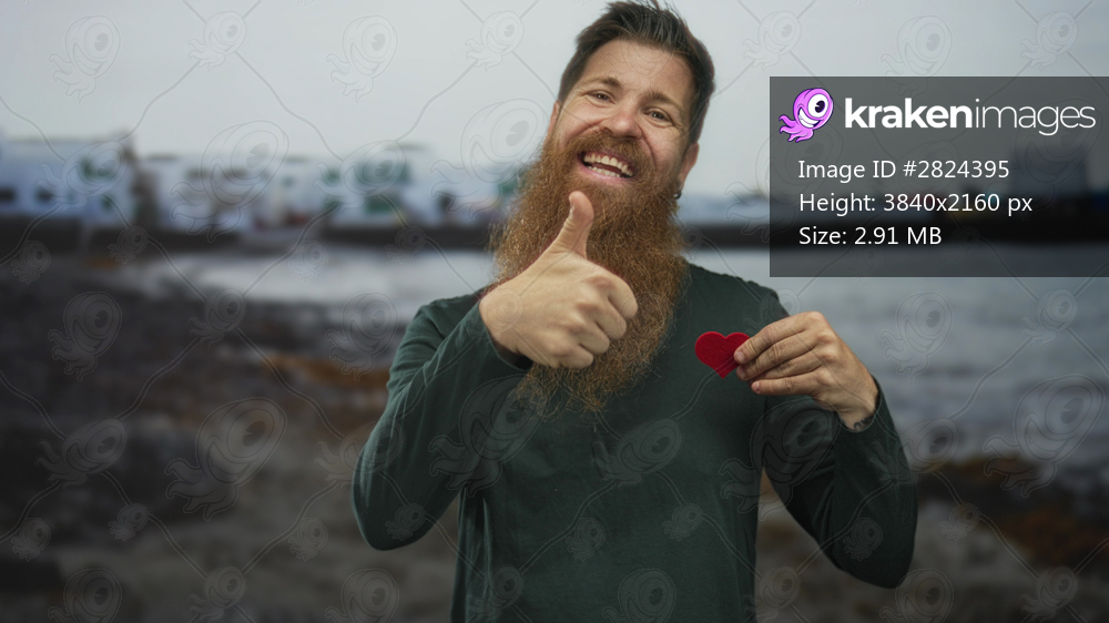 Man gives thumbs up while smiling broadly and holding a red heart cutout at a rocky shoreline beach scene behind him; love.