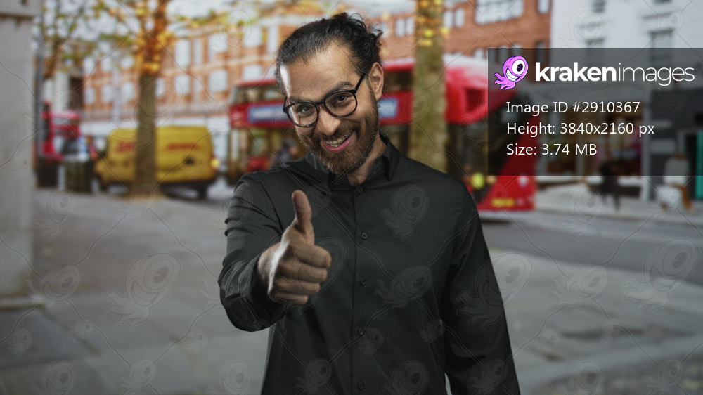 Man giving a thumbs up gesture on a city street with red double decker bus and delivery van nearby, smiling and wearing glasses; approval confidence friendliness. - Kraken Images