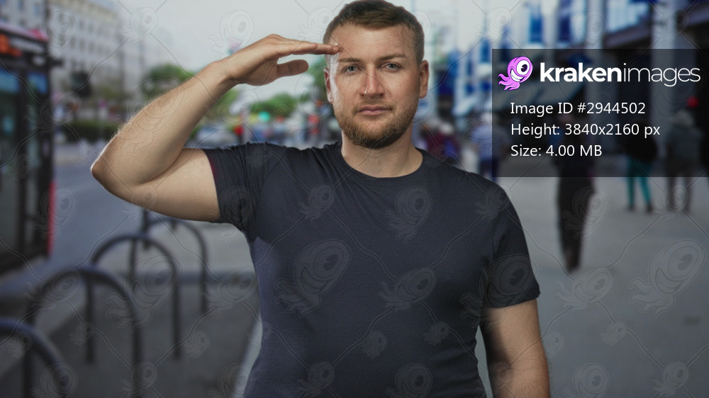 Man giving hand salute to forehead on a city street with bike racks and blurred pedestrians in the sidewalk; respect.