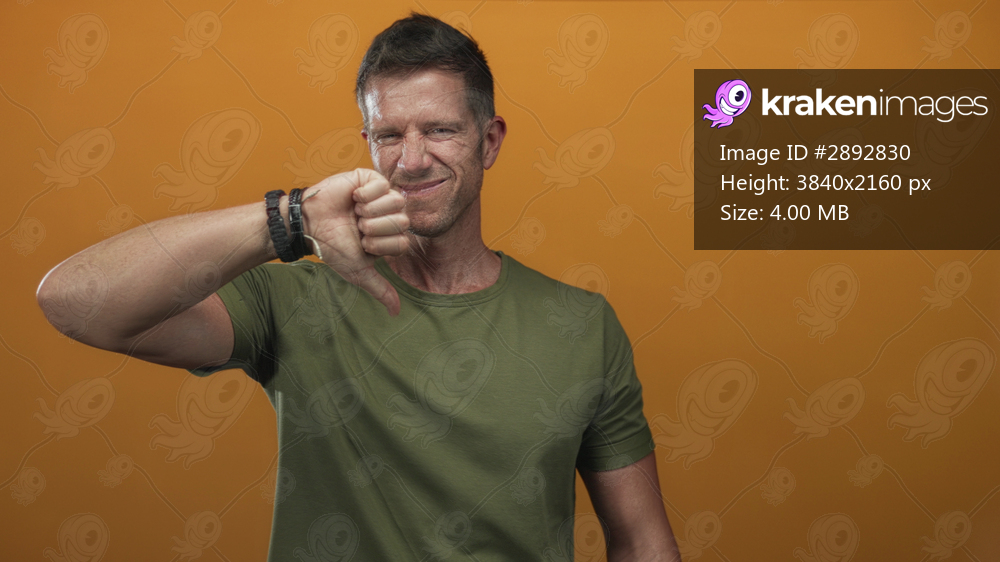 Man giving thumbs down with bare hand and wrist bracelets, winking and squinting while wearing green shirt in orange studio; disapproval critique.