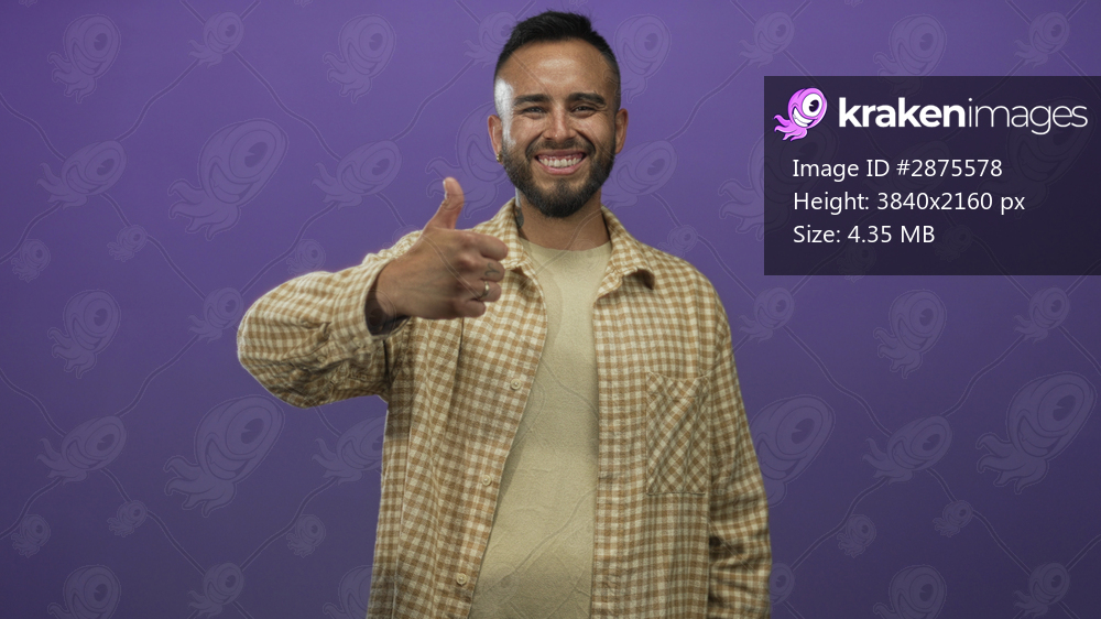 Man giving thumbs up gesture in a purple studio, smiling at camera wearing checked shirt and rings; optimism approval support.