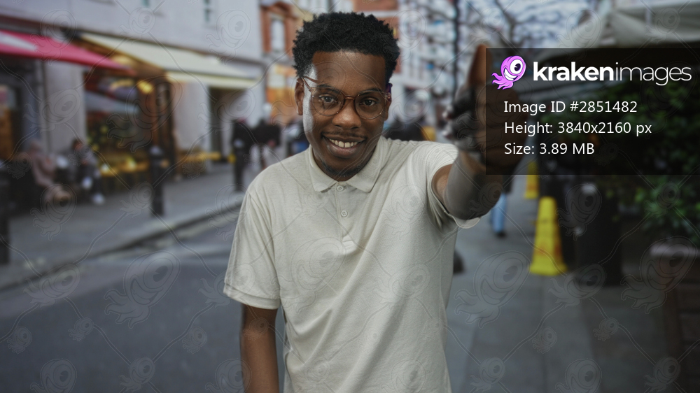 Man giving thumbs up with gloved hand wearing glasses on urban sidewalk street lined with cafes and passersby; approval.