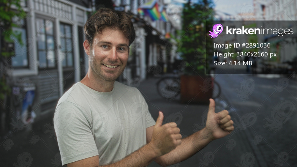 Man giving thumbs up on a city street while smiling and glancing sideways; friendly approachable optimism.