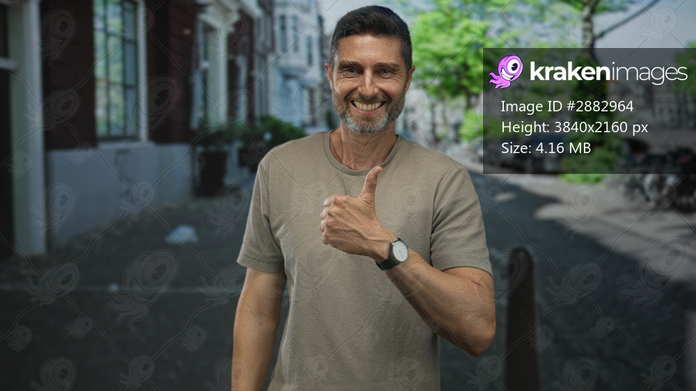 Man giving thumbs up on street, smiling with bare hand raised and visible watch, wearing beige tshirt near city buildings and parked bicycles; confidence approval. - Kraken Images